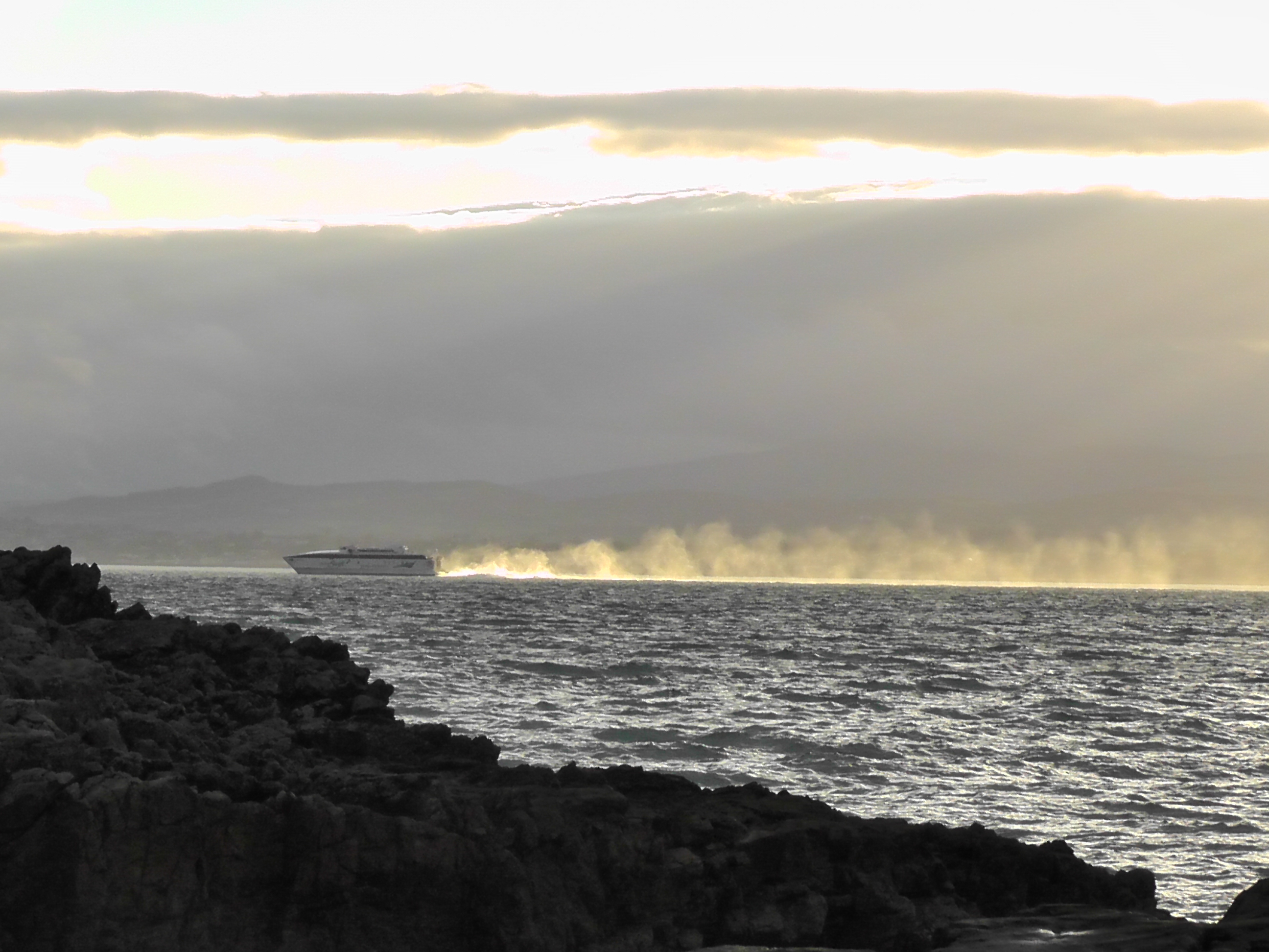 I made it to the summit in good time, and stopped off at the little shop at the top for a coffee. They had a special offer running – if you bought a coffee, you could get a toasted panini for a mere 99c – bargain! I set off along the next part of the trail with my latte and cheese, tomato & onion panini in hand, just the thing to ward off the piercing cold. As I rounded a corner, a rainbow appeared along the edge of a cloud, dropping down just over to my right to end amongst some trees, such a lovely sight to behold. A boat hurried by on the water to my left, throwing up spray that caught the diffused light from the breaking cloud cover. So much to look at, I had to remember to pay attention to the trail, as it was getting tricky now, weaving up and down, perilously close to the edge.