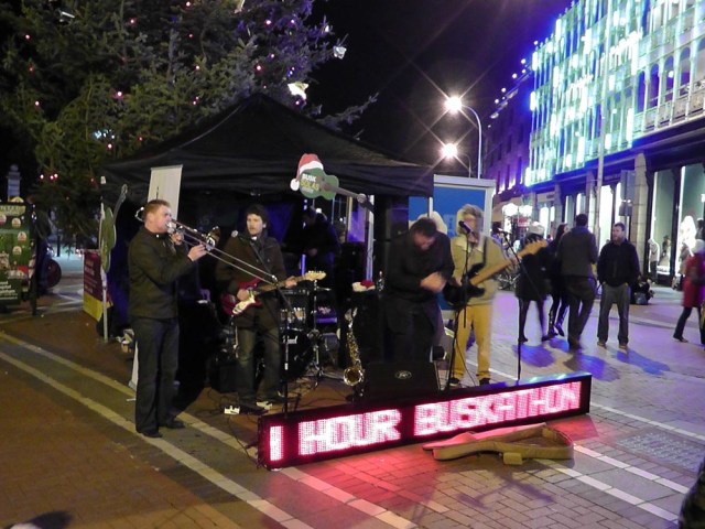 Again, seriously? I’ve always maintained that we Irish are a proud nation, but it would appear if there’s a chance of making a quick euro, pride can go by the wayside. 🙂 And off up Grafton Street, which was alive and kicking with buskers. Now busking (as opposed to standing in a leprechaun suit looking for euros) is a noble profession in Ireland; U2 cut their teeth busking on Grafton Street. The passersby take the buskers seriously, if they’re putting on a good show. In other parts of the world busking is viewed as less than noble, but here, it is a time-honoured rite of passage. There was even a buskathon in aid of the charity Solas taking place at the top of Grafton Street.