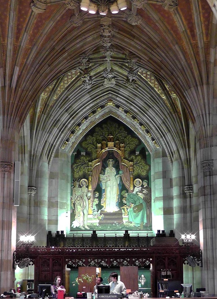 Sterling Memorial Libary's circulation desk, with Mother Yale in the background