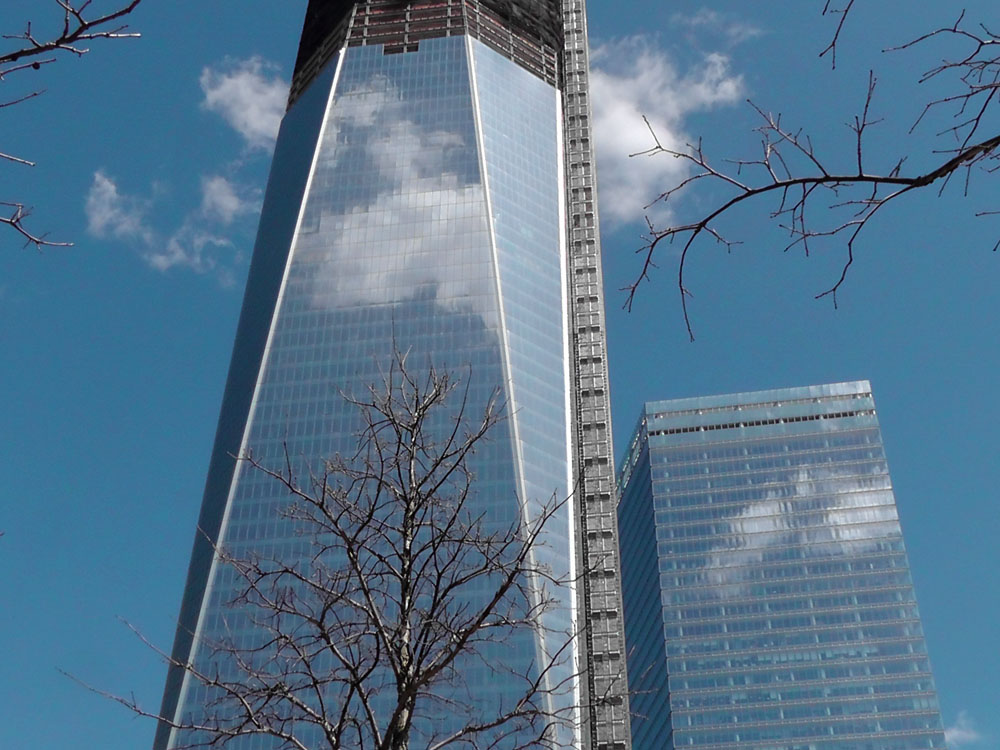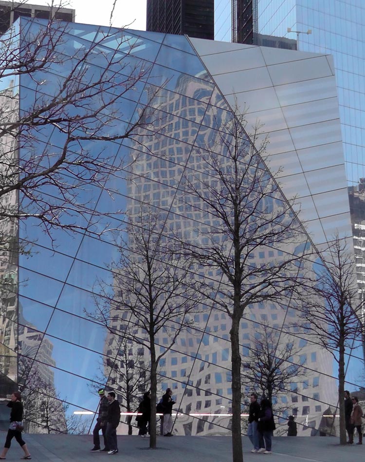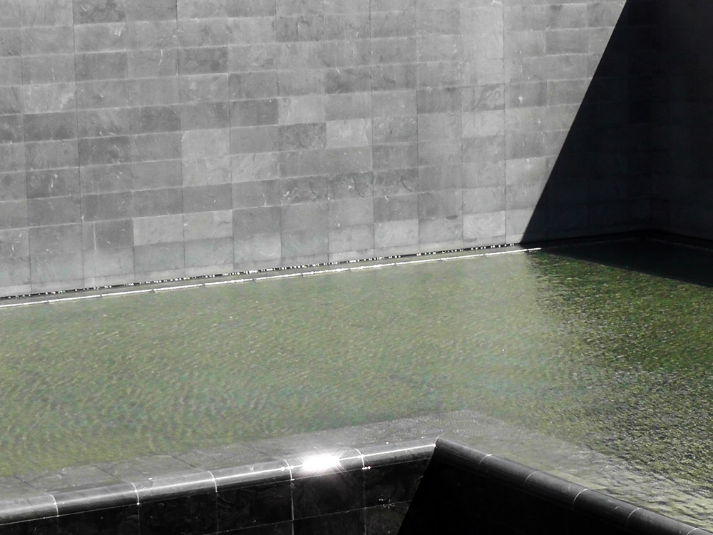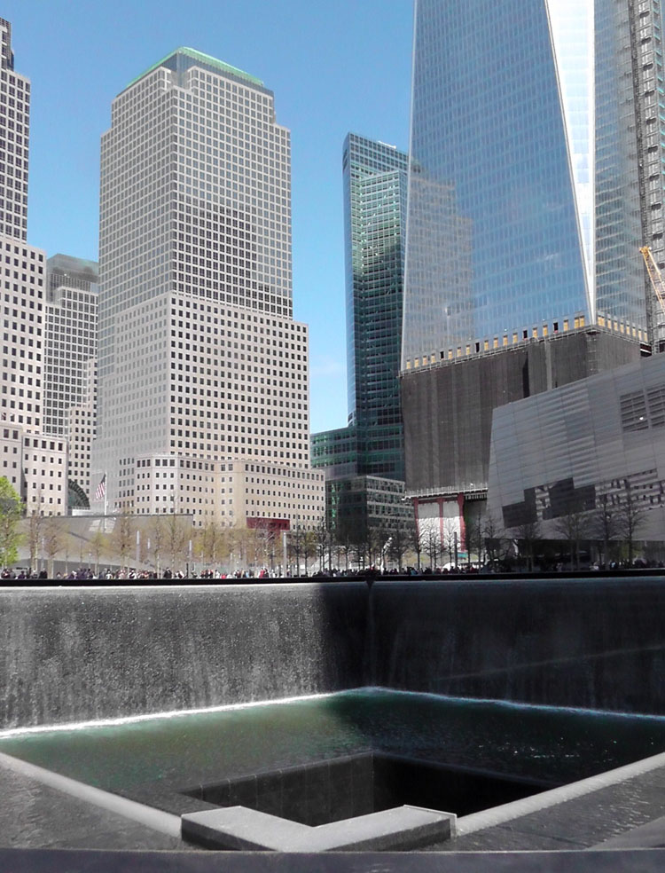 In the footprints of the Twin Towers that were destroyed in 2001, there are two square reflecting pools; each of them an acre in size, with the largest man-made waterfalls in the United States cascading down the sides of each pool. The names of those who lost their lives that day, in the towers, in the airplanes and on the ground in rescue attempts, adorn the edges of each pool. The sound of the tumbling water is enough to drown out all ambient construction clamour, lending a truly contemplative atmosphere to the space. In the centre of each pool is yet another square, into which the surrounding water tumbles once again, evoking the void that was left in the wake of the attacks and the terrible loss of life.