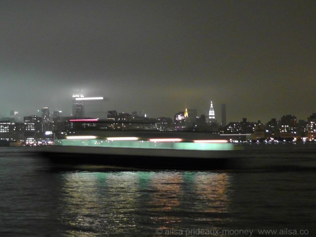 I was on the banks of the Hudson river last night, hoping to photograph the Supermoon, which never made an appearance from behind the cover of the Superfog engulfing Manhattan. I had my camera set for 30 second exposure and just as I was taking this photo, a ferry streaked into view. I still quite like it though, because the reflections in the water look great even though everything else went haywire.