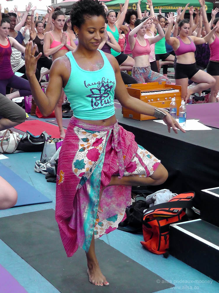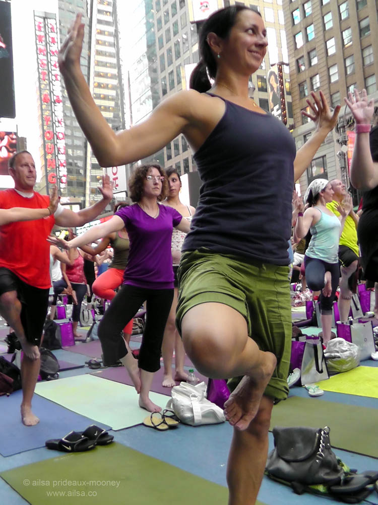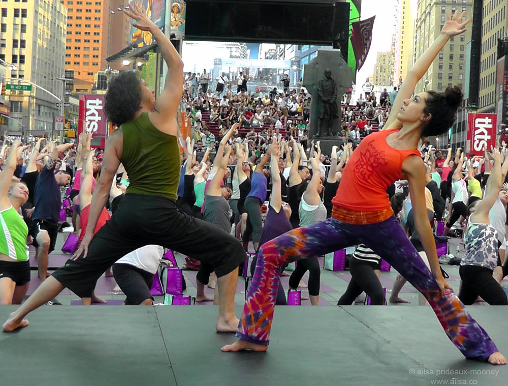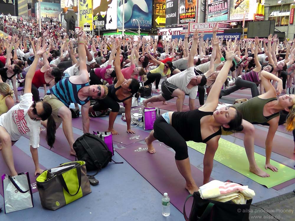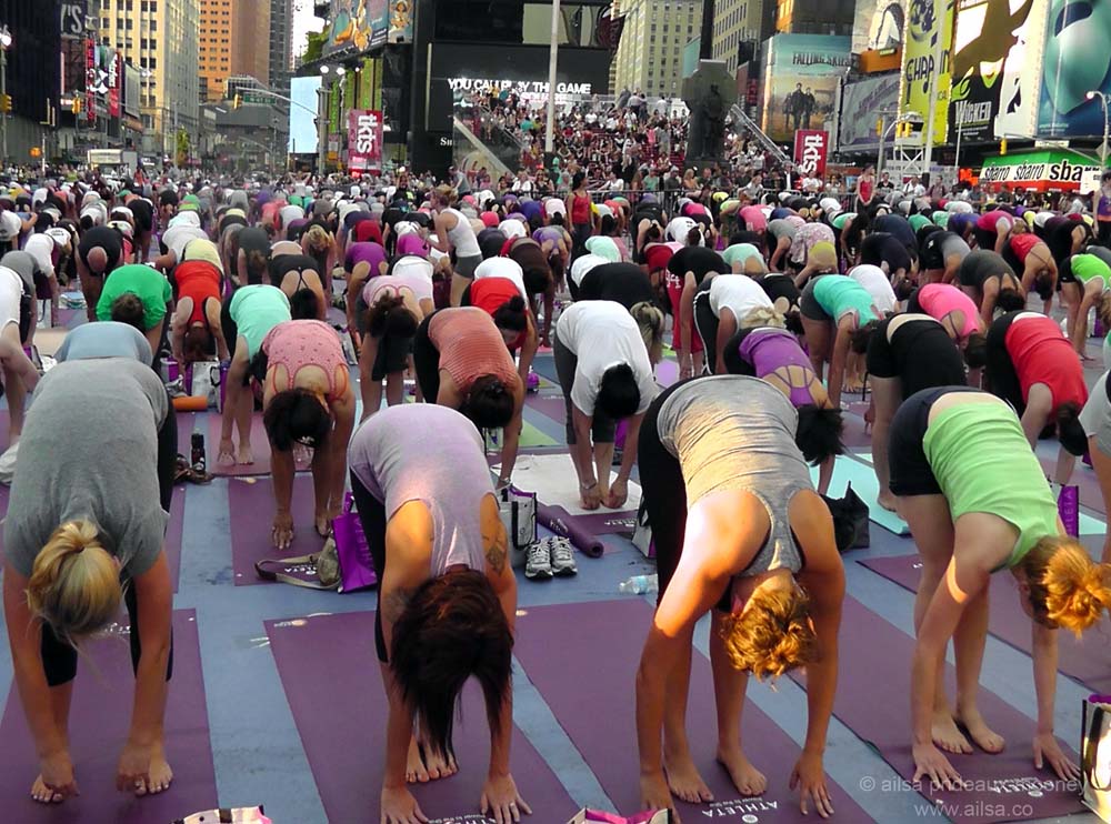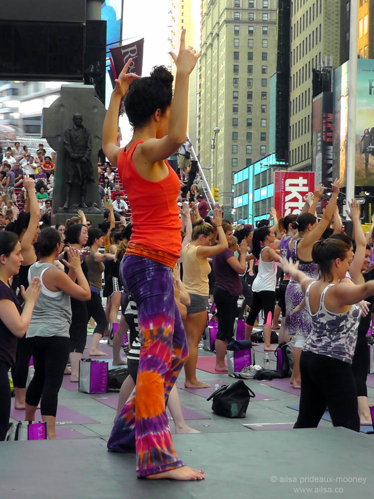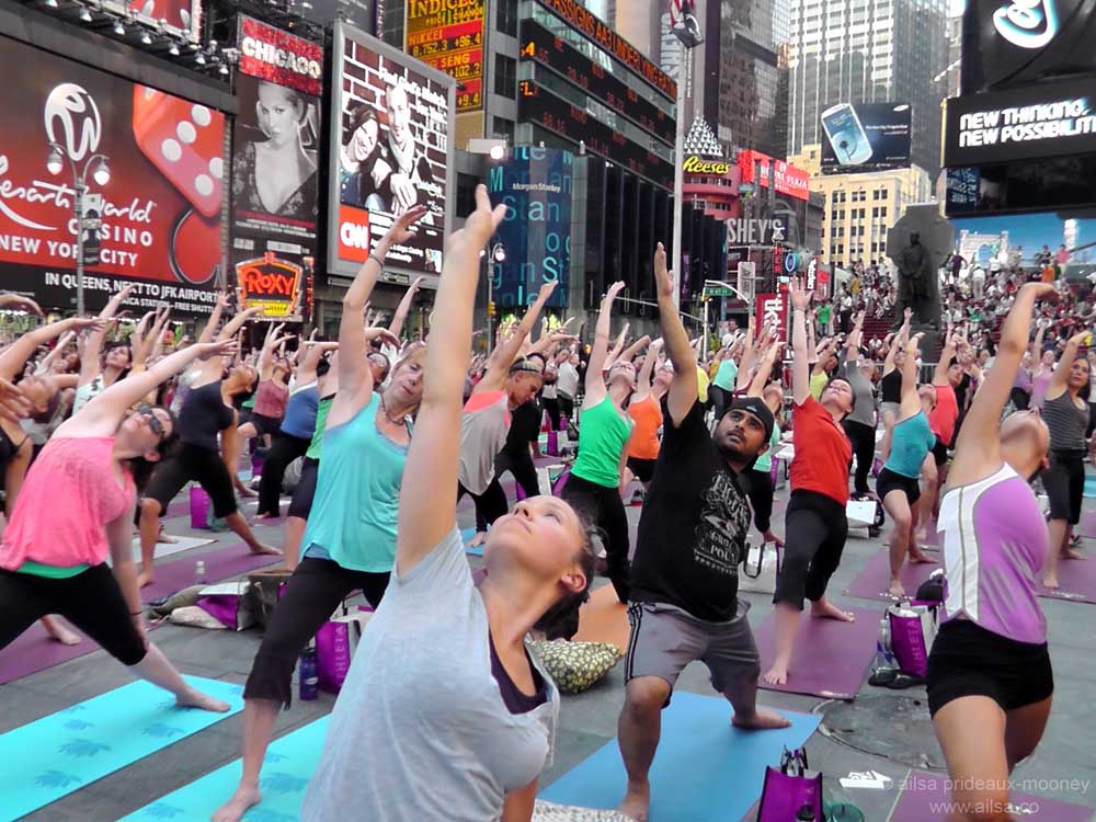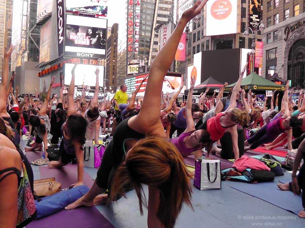 Noel Coward once wrote a song with the lyrics “Mad dogs and Englishmen go out in the midday sun” and I think New Yorkers should be added to that list, because as the heat continued to rise, thousands of people grabbed their yoga mats and headed out to Times Square to salute the sun on the solstice. Organised by the Times Square Alliance, this annual event is now in its tenth year.
