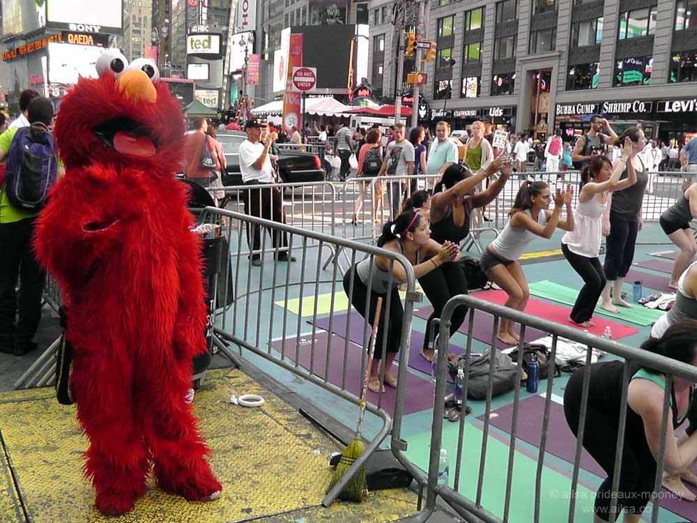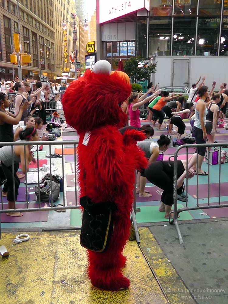 Yoga in the streets of Manhattan is pretty groovy, indeed. But let’s take a moment to ponder the poor guy stuck in the Elmo suit, in hundred-degree heat. Oh, Elmo-guy.