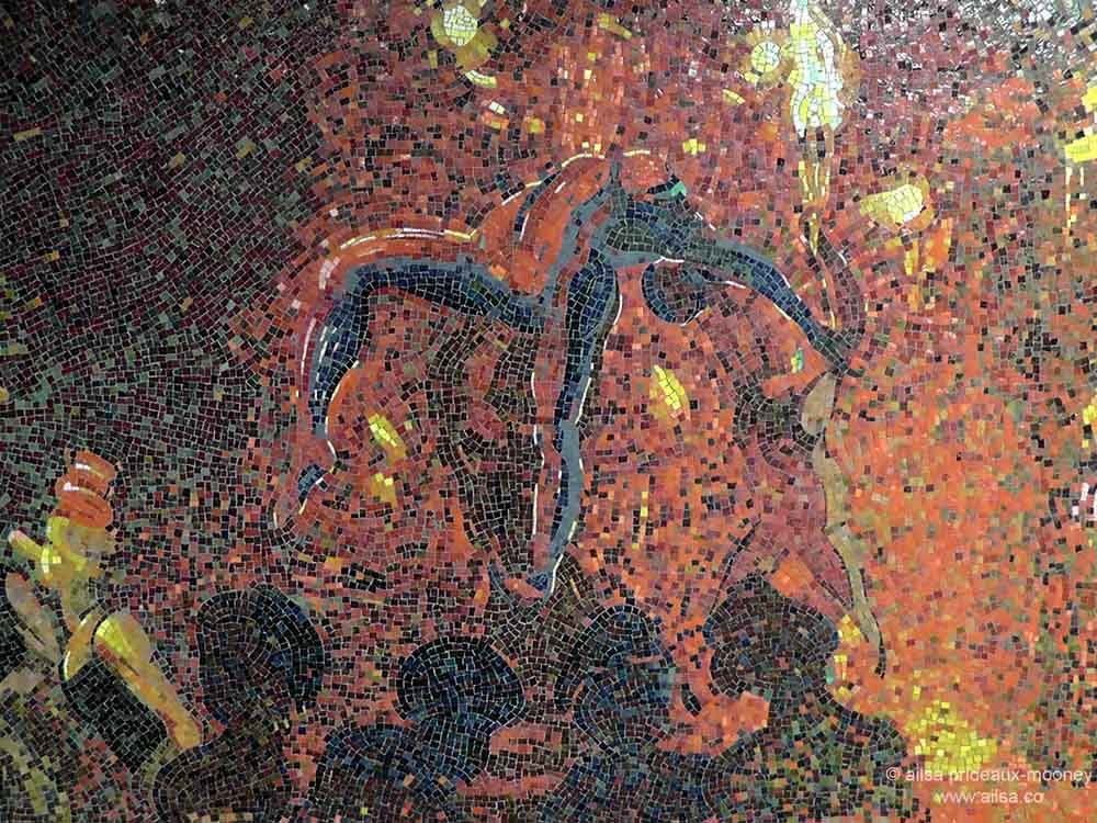 It was on just such a day that I got a little lost on the way to Penn Station. I usually enter the station from street level, but this time, I got off at the 34th Street A/C/E station and absentmindedly followed a sign for Penn Station that led to one of those dreaded tunnels. It was quite empty – presumably because everyone else had wisely opted to get outside as quickly as possible. As I forged on, wondering how long it would take for me to go down with heatstroke, I rounded a corner and was greeted by a Garden of Circus Delights. No, it wasn’t a mirage, it was a fabulous glass mosaic by artist Eric Fischl, adorning the walls of the tunnel leading towards Penn Station.