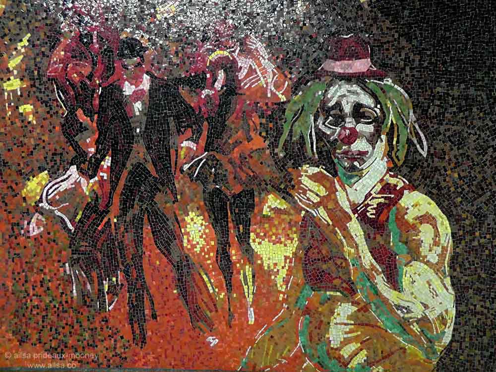 The series of mosaics tell the story of a commuter who gets magically drawn into the weird and wacky world of the circus on his way to work. You follow his circus adventures as you travel along the tunnel, and at the end, he re-emerges, surrounded by white, still a commuter but somehow transformed.