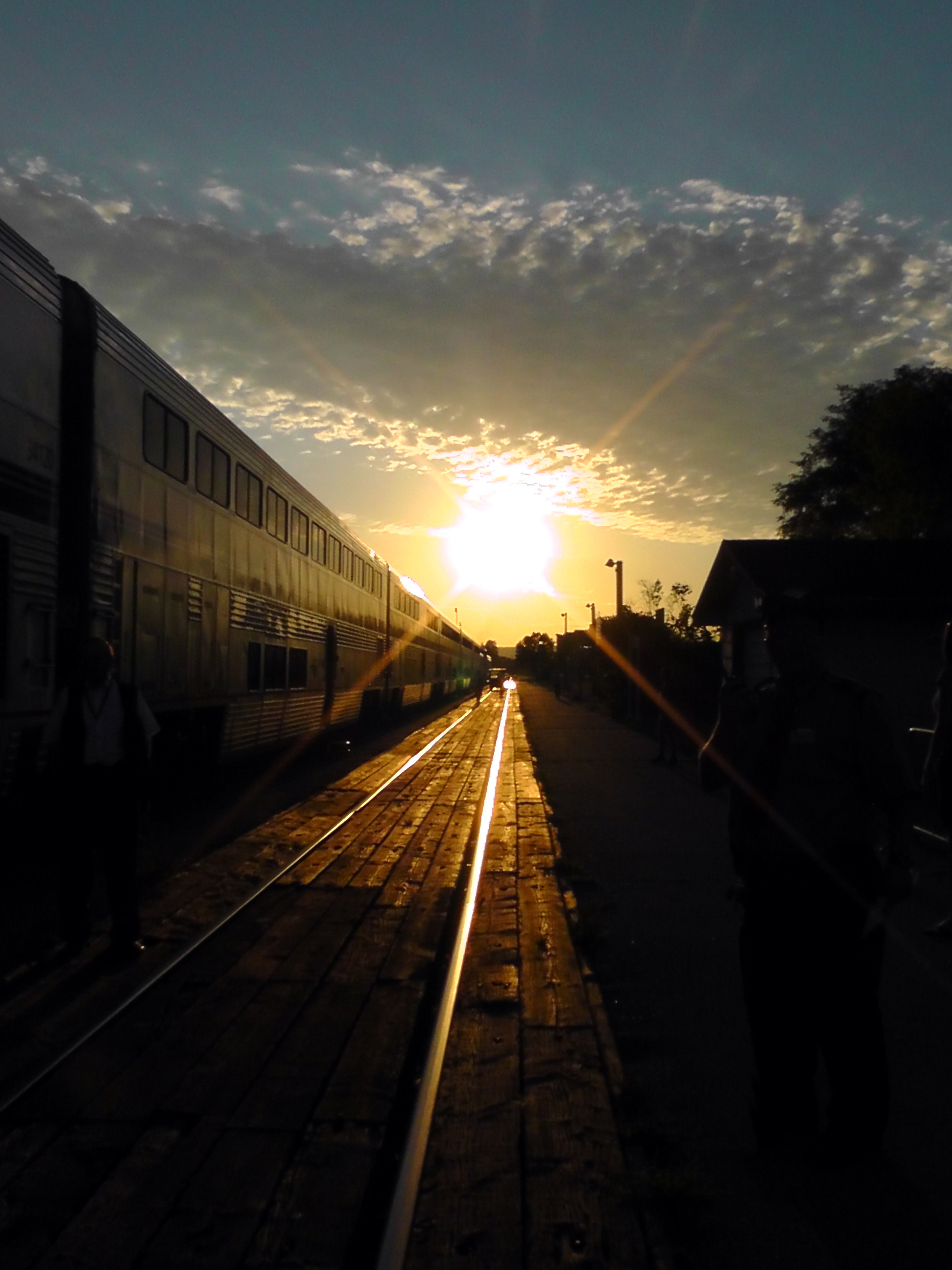 As the sun began to set, the train made a brief stop and I got out for a breath of fresh air. The sinking sun glinted along the tracks as I walked along the platform.
