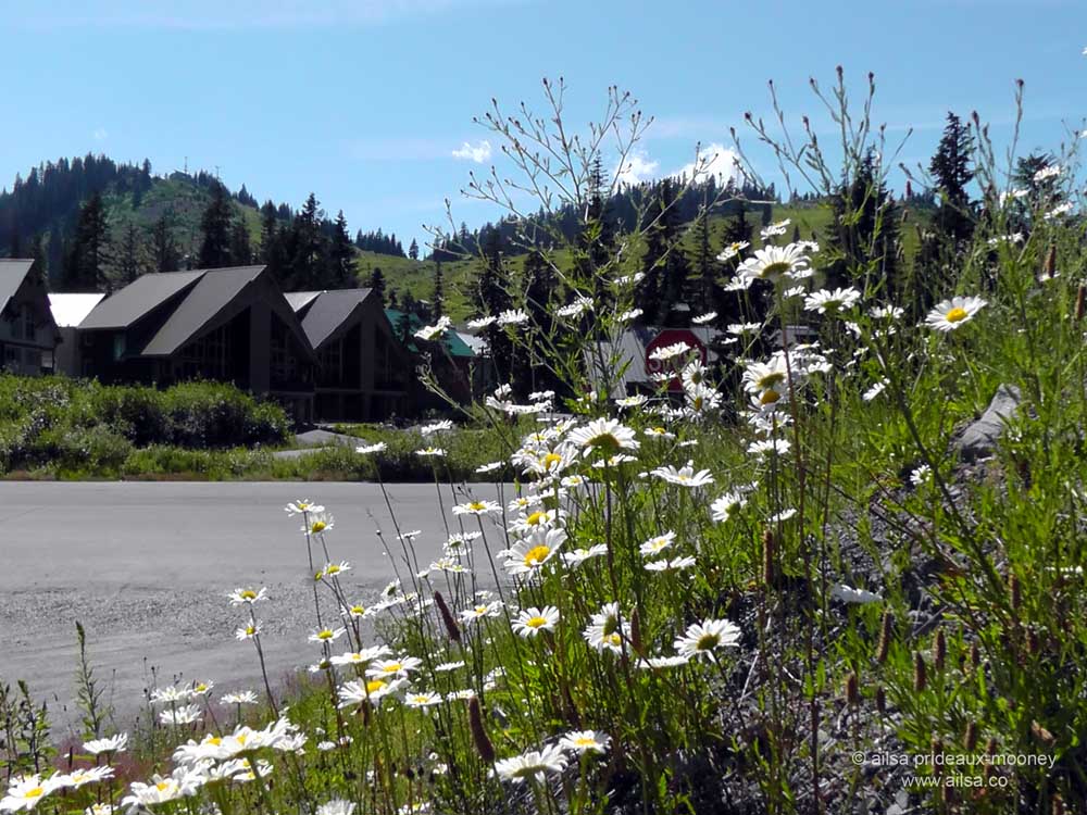 Just as the needle of the fuel gauge dropped down to empty, traffic started moving. Relieved, we drove on through the mountain pass and pulled off at Snoqualmie. Sprocket got out for a walk and a big bowl of water as we filled up the car and stocked up on bottled frappuccinos for the trip. Drifts of daisies filled the banks and swayed before slopes of coniferous trees and darkly modern alpine cottages. It was a glorious afternoon.