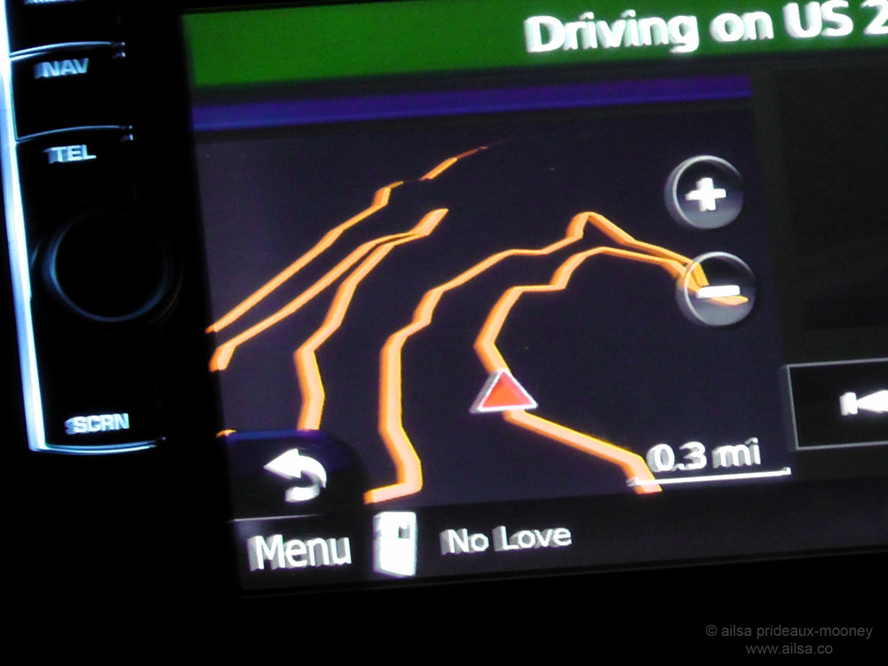 And then things started to get very strange indeed. About fifteen miles out of Cooke City the GPS display started doing a dance. The bright orange glow indicating the road ahead turned from a straight line into a wave, and the road we were travelling along started to weave from left to right and up and down. Road signs dotted the way, warning of winding roads ahead, and then the GPS display erupted into a swirling tangle of orange that more resembled a plate of spaghetti than a road.