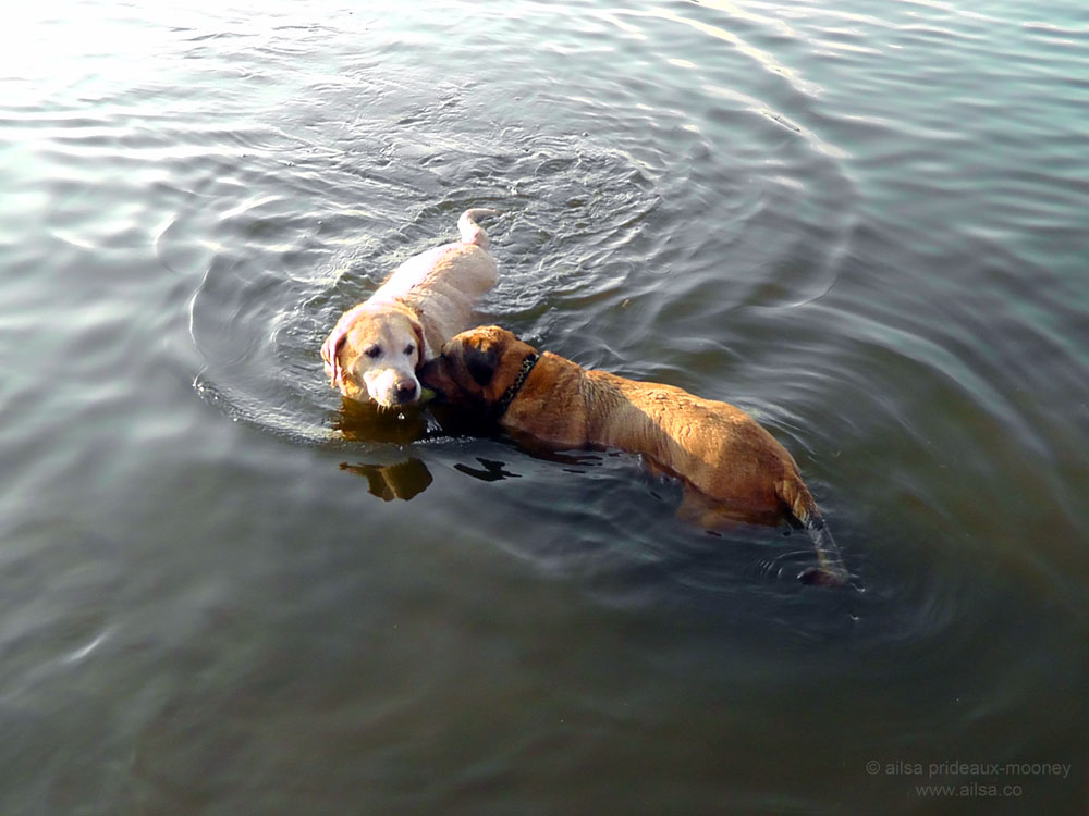 He wanted desperately to join in; I could tell by the way he got as close to the edge as he dared, at one point fitting all four of his paws into one square inch of pier, but despite everyone’s entreaties for him to take the plunge, he couldn’t quite muster up the courage. It was time to employ the distraction method. I grabbed a tennis ball – no doggy can resist a tennis ball – and waved it in front of his nose. He followed me and the ball back along the pier to the safety of the lake edge, down some stone steps and into the water. When he was standing in the water I let him have the ball, which he gleefully brought back to dry land. Once again I picked up the ball and led him down the steps, letting the ball gently bob in the water. He snapped at it and it bobbed a little further out, so he followed it and suddenly he was swimming.