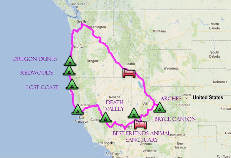 In the end, we decided to do a mix of motels and camping. On the first day we would drive all the way to Twin Falls and stay at a motel so we didn’t have to worry about pitching a tent late at night. On the other days when we had shorter distances to drive, we would camp, except for one night after visiting and volunteering at an animal sanctuary, anticipating we would feel the need for a motel and a shower that night. Somehow, with major editing of the original route and concessions on both sides, we cobbled together a journey that might just work. Maybe. Here’s what we came up with: