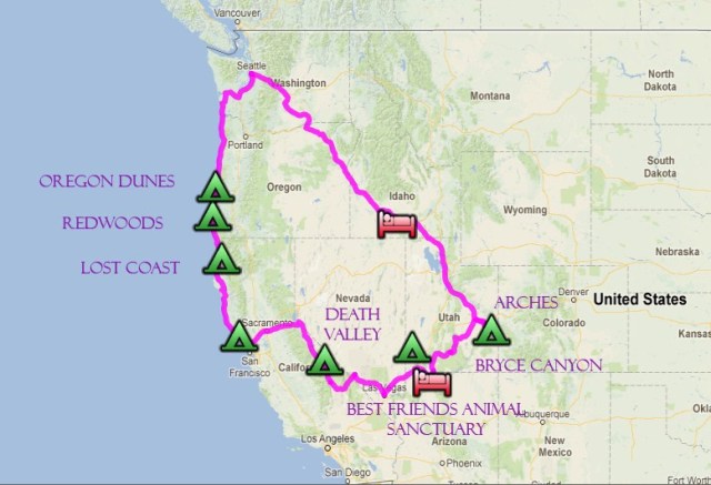 Oh gee….that is a LOT of little triangle camping spots and not so many motel beds….. I am pretty brave, but not sure if I would be that brave. 🙂 Can’t wait to hear the rest.