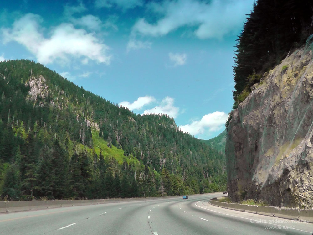 But they were staying behind to keep Jill’s husband company as we tootled around the country on our road trip. So we got in the cab of the pickup and set off, stopping to pick up more coffee to go before crossing the West Seattle Bridge and turning north onto I-5. Then we peeled off onto I-90 and were truly on our way. The Cascades loomed familiarly and lushly green through the windshield as I-90 carved a channel through the mountains towards Snoqualmie Pass.