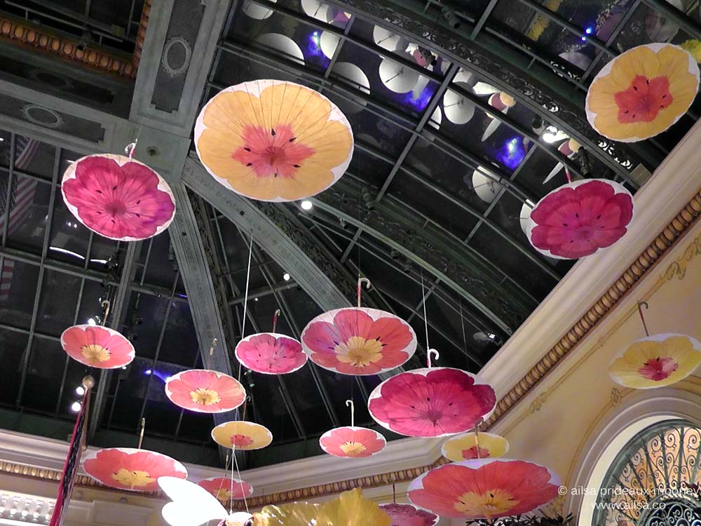 Further into the lobby, it felt like we had gone down a rabbit hole, with all kinds of strange and disturbing crepe birds drifting from the ceiling, balloon and umbrellas suspended overhead and strange mirrored orbs levitating and gushing water.