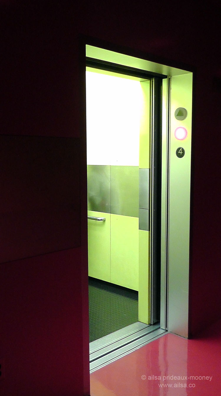 On the way down, you have two options – walk down through the books spiral or take the elevator. If you go for the latter option, be prepared for yet another splash of colour and make sure to press the button for floor 4. The elevator encloses you in a symphony of chartreuse and chrome….