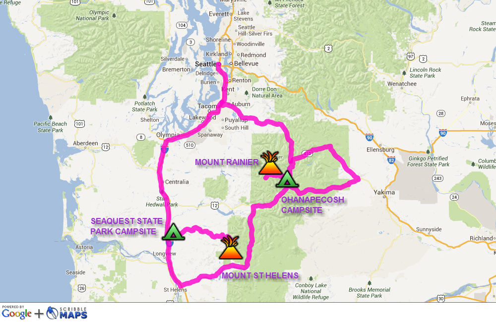 We had originally intended to visit Rainier first and then go south to Mount St Helens, but as we watched the weather man on the local news station carefully place little cardboard cutouts of black clouds with lightning bolts shooting out of them all around Mount Rainier, we decided to go to Mount St Helens first. We also threw in a possible loop over to Eastern Washington in case of sudden downpours. This is the proposed route we came up with.