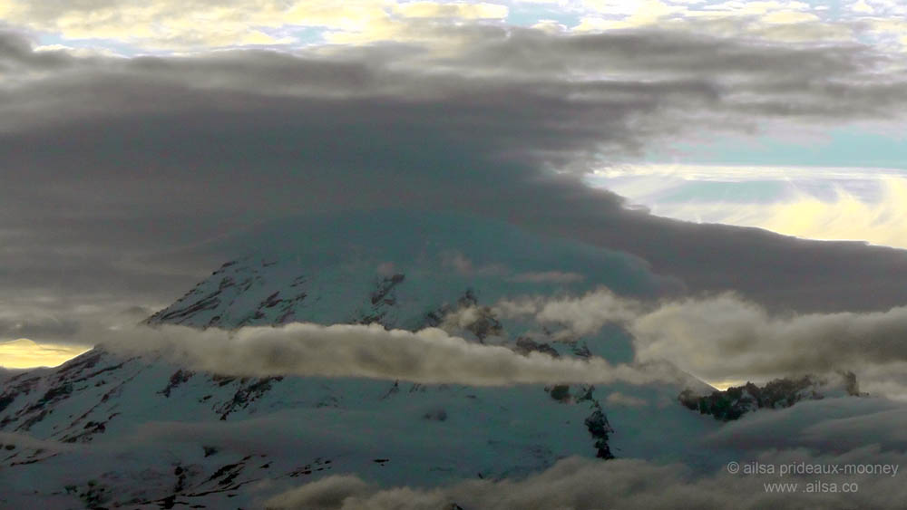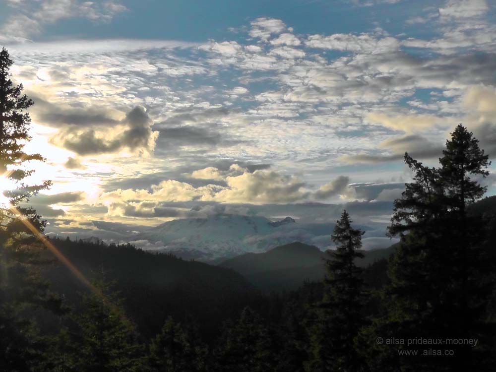 We stopped at the nearest pullout and sat on a stone wall watching the clouds swirl around Rainier’s majestic cone as the dying sun traveled towards the horizon and dipped out of sight.