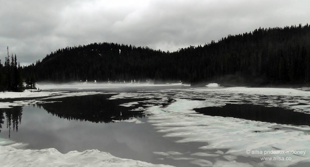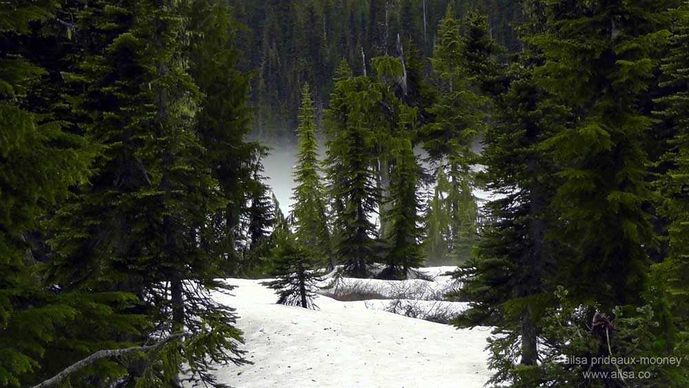 Even without Rainier’s watery reflection, the lakes were dazzling. Icy fog drifted across the surface and the snow smelled so clean and enticing we simply had to walk along the shore, knee deep in sparkling powder that erupted in frosty flurries with each step.