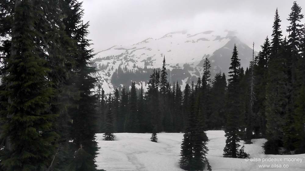 We didn’t stop because we were on a mission. Up ahead lay one of the most iconic views of Mount Rainier, mirrored in the aptly named Reflection Lakes and we were hoping against hope that the volcano would grace us with an appearance. The higher we climbed, the thicker the fog grew and broad banks of packed snow lined the roadway. Our ears began to pop just as we rounded a corner and Reflection Lakes burst into view. Mount Rainier did not, sulking moodily behind swirling mists so impenetrable I would scarcely have believed a hulking volcano lurked nearby, were it not for the helpful sign with a depiction of Rainier on a clear day.