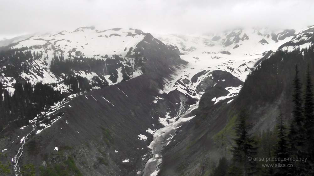 It was with a sense of anticipation that Jo and I sprang into action upon rising. The weather forecasters had promised us a clear, sunny day to explore Mount Rainier but the dense canopy of trees overhead scattered raindrops down upon us and tendrils of fog crept through the highest branches. Undeterred, we packed our gear into the car and got ready to leave. We still had to pay for one more night of camping but had arrived at the campground late and the automatic ticket machine had clicked over to another day. The ranger station at Ohanapecosh was closed so we figured we’d pay at the station in Paradise, but there was a note on the car window inquiring about the missing night’s ticket so we looked around for a ranger. The note was signed Ranger Rick, which set Jo off giggling. I had no clue why, and when I spied a chap in ranger gear up ahead I shot up to him and asked “Are you Ranger Rick?” He beamed broadly. Not growing up in the United States, I was completely unaware of the famous children’s wildlife magazine of the same name (Jo explained it to me later.) We told Ranger Rick of our predicament and he cheerily waved us on our way with a promise to pay at Paradise. As I was taking my leave, it dawned on me that he’d left the ticket on the car while I was still asleep in the back seat. “So when you left the ticket on the car…” I started and he chortled. “Taking car camping to a whole new level” he grinned and I scuttled off red-faced at my outdoorsy unworthiness.