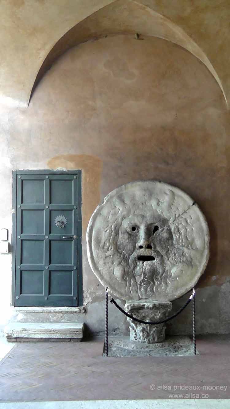 The portico is home to a most unusual and extremely popular sculpture – La Bocca della Verità, otherwise known as the Mouth of Truth, which came to worldwide attention in the classic movie Roman Holiday starring Audrey Hepburn and Gregory Peck. The term ‘Bocca della Verità’ was originally a term applied to public letter boxes in the Middle Ages, where people could anonymously drop letters accusing fellow citizens of sinful behaviour, but it has since evolved to refer to this sculpture in particular.