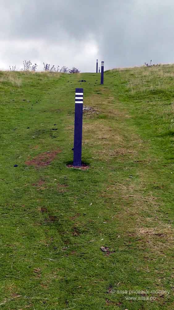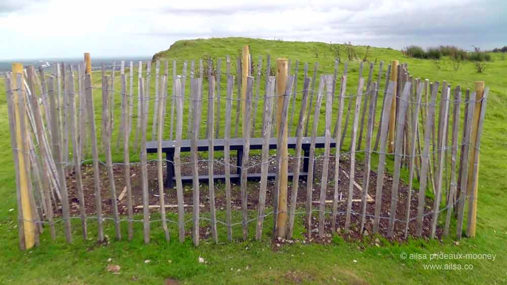 The footpath led to a turnstile that opened onto a seemingly endless meadow. An uphill trail was marked by a series of posts and an OPW (Office of Public Works) sign urged visitors to stay on trail. The incline was enough to raise the heartbeat and a sweat so when I crested the hill I was excited to start exploring, but it turned out to be a false summit. Inexplicably, there was a small wooden bench surrounded by a wooden fence that suggested you had reached somewhere of note, but the only noteworthy thing I noted was the bench and the fence in the middle of a wide open field. Perhaps it was simply a place for weary visitors to rest on their way to the destination proper. I loved the unapologetic oddness of it; it felt intrinsically Irish.