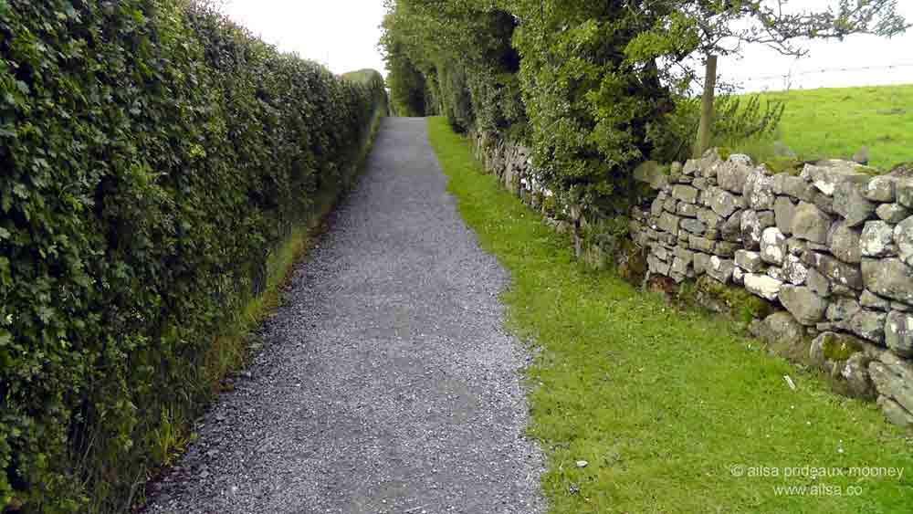 This poor, doomed witch goes by many names. She appears in legends across Ireland, Scotland and the Isle of Man in various incarnations as Mother Earth, the Bringer of Storms, the Moon Goddess and the Goddess of Winter. Her mountains in the northwest of Meath are home to some of Ireland’s most ancient monuments and Stone Age art so it was in this direction I pointed my car one stormy Sunday morning. Loathe as I am to travel by toll roads, I took the scenic route, starting along the M4 west from Dublin instead of the more direct M3, and zigzagged my way northwest along Meath’s back roads. It was plain sailing as far as the castle town of Trim but after that the road quality dropped off and I got to experience the authentic Irish driving ritual of dodging potholes, blind corners and tractor traffic jams through Athboy and on towards Oldcastle. Just shy of Oldcastle I turned up a lane the width of my car and as steep as a cliff face. At the top a small car park with an information sign told me I had reached my destination so I parked and started along a small footpath in search of antiquity.