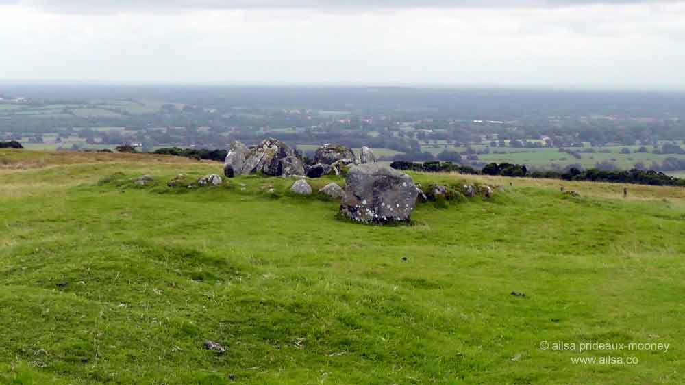 Northwest of Dublin in the county of Meath there is a strange and mystical string of hills known collectively as Sliabh na Cailli, which translates as Hills of the Witch but more commonly referred to these days as Loughcrew. The three main peaks are Carnbane West, Carnbane East (aka Witch Mountain) and Patrickstown and legend calls them The Witch’s Footsteps, for they were created by a witch and giantess who carried boulders in her apron and created these stone-capped peaks by dropping the rocks she carried. In various versions of the legend she either leaps by her own power or jumps on horseback from peak to peak, but all versions end in tragedy when she stumbles and falls to her death at the final peak of Patrickstown.