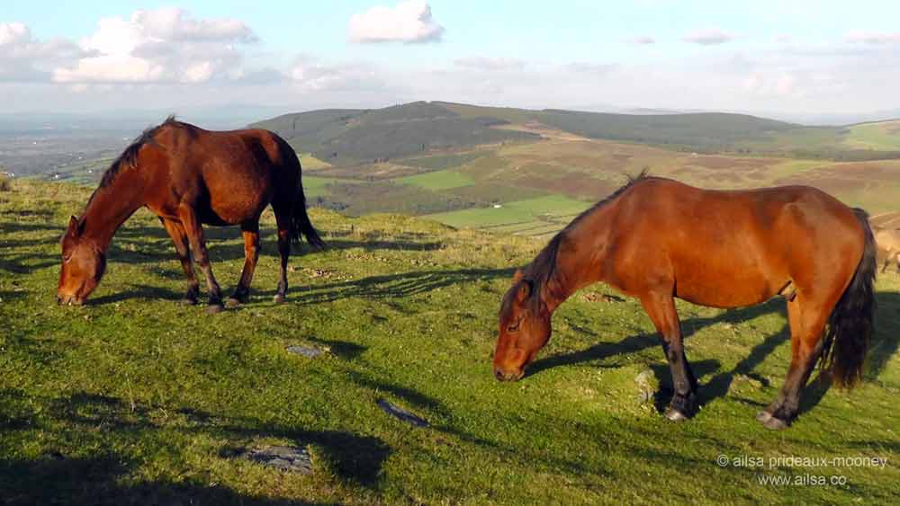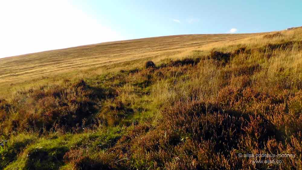 I followed the horses into the car park and got out to gaze up at the noble mountain I had come to see. It loomed golden brown in the autumn sun, with a neat pair of vertical lines scarring one side. Known as the Cailín Slipes or the Witch’s Slide, local legend tells of giants and witches inhabiting these hills in the distant past. One particular witch, the one who ruled Mount Leinster, had a falling out with her sisters in Wicklow and Wexford and in a fit of sibling rivalry, she grabbed a huge rock and went to throw it at them. Instead, she slipped and skidded down the mountain leaving those giant tracks behind…