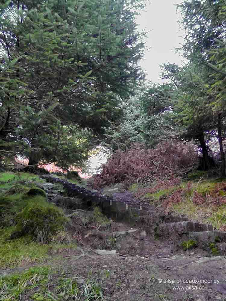 Leaving the waterfall behind the trail veered off to the right through thickening forest and up ahead I spotted the start of the infamous steps.