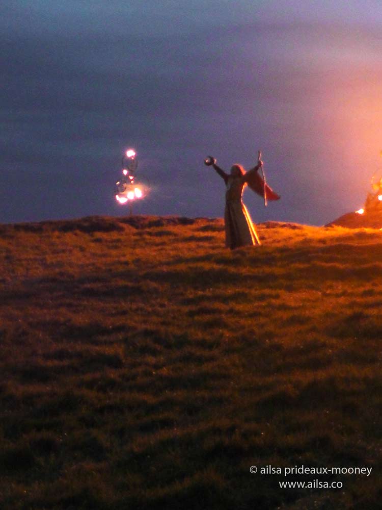 As the light grew dim, preparations began for the highlight of the festival; the great bonfire. Off to one side in an ancient ring fort. parade members readied themselves in their costumes…