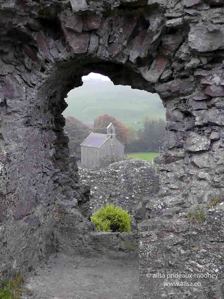 …past ivy-clad walls gently crumbling away, stopping every so often to peep through nooks and crannies and windows in the ruin walls that offered tantalizing glimpses of the foggy countryside below and the small granite church standing guard at the base of the hill.